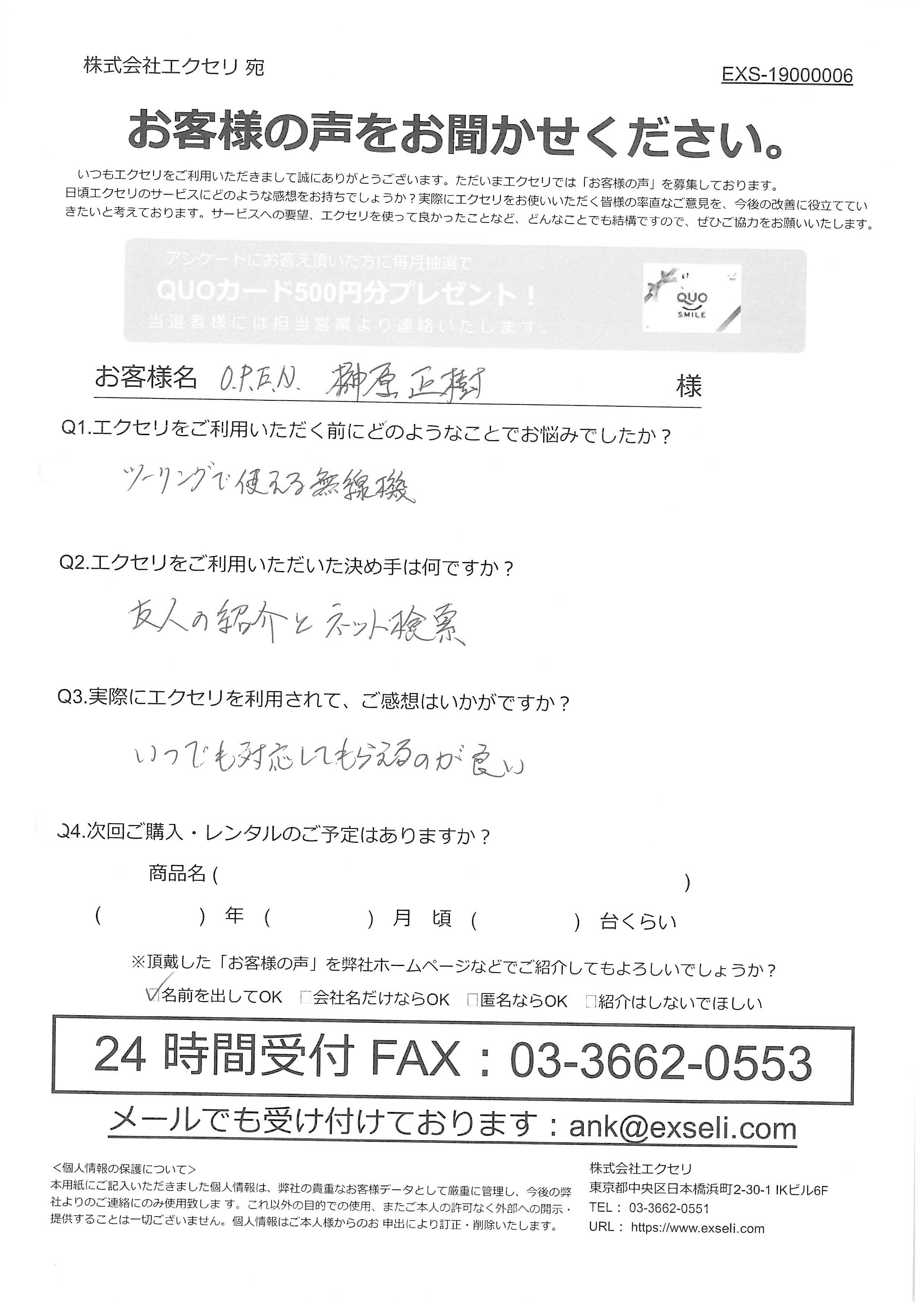 以前は無線機が高額なことに悩んでいましたが、御社でリース契約を利用して、他社より安価に無線機を導入することができて、大変良かったです。