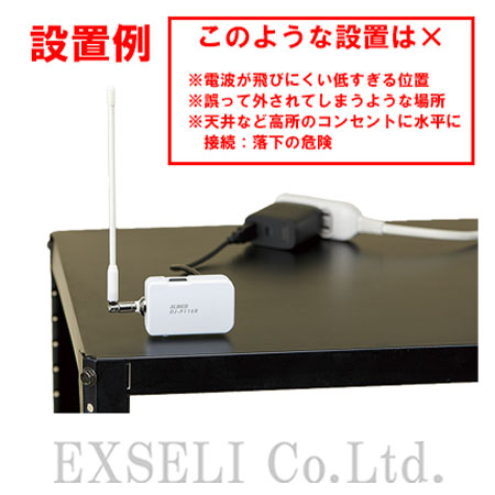 机の下などの電波が飛びにくい低い場所に設置すると通信に支障が出る可能性がございますのでおやめください。また、天井付近など高い場所に設置すると落下の可能性がございます。推奨の設置方法としては直接コンセントに挿さないでコンセントからケーブルを伸ばし、ロッカーや棚等の上に固定してご使用ください。