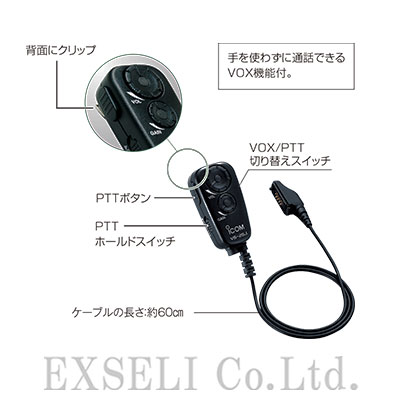 ●イヤーフック型ヘッドセットHS-94、ネックアーム型ヘッドセットHS-95、咽喉マイクロホンHS-97、耳かけ式イヤホンマイクロホンHS-99に装着可能なPTT/VOX スイッチユニットです。