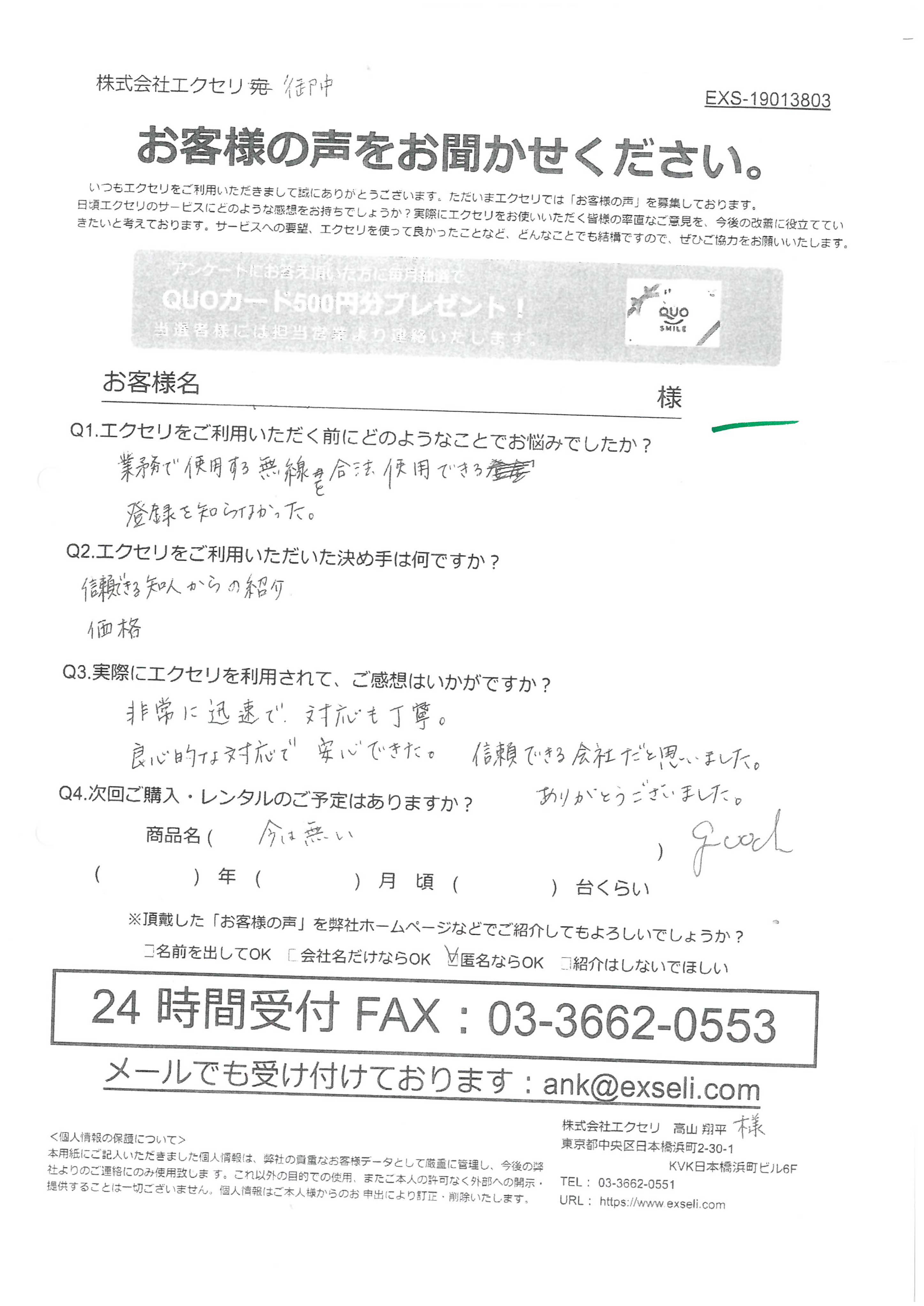 A3.購入予定の機器を無料貸し出しして頂けて、実際の現場で試すことが出来た為。見積や商品の発送など迅速に対応頂けて助かりました。